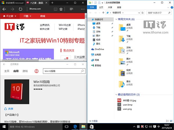 8、Aero Snap窗口布局 微軟曾經(jīng)在博客中專門介紹過Win10的升級(jí)版Aero Snap功能。和Win7/Win8.1不同的是,Win10版加入了很多新功能,比如窗口在屏幕四角停靠等。