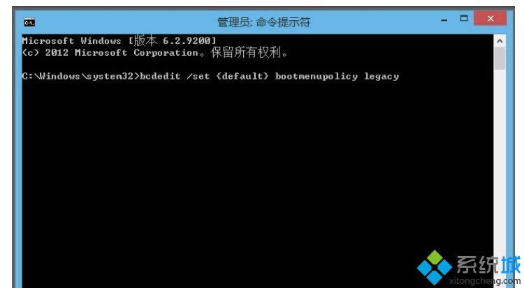 2、接著在打開的命令提示符窗口中輸入:bcdedit /set {default} bootmenupolicy legacy 如下圖所示;