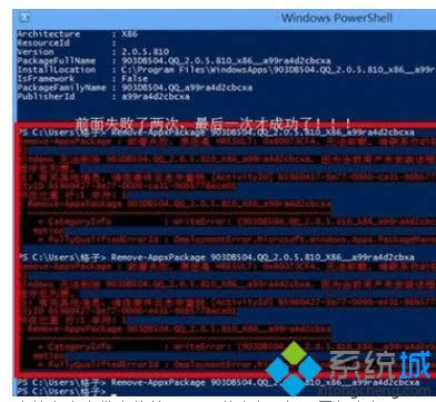 4、繼續(xù)輸入Remove-AppxPackage <你要卸載的PackageFullName>,PackageFullName就是程序包返回的信息,比如要卸載是QQ,則輸入 Remove-AppxPackage 903DB504.QQ_2.0.5.810_x86__a99ra4d2cbcxa,如下圖所示: